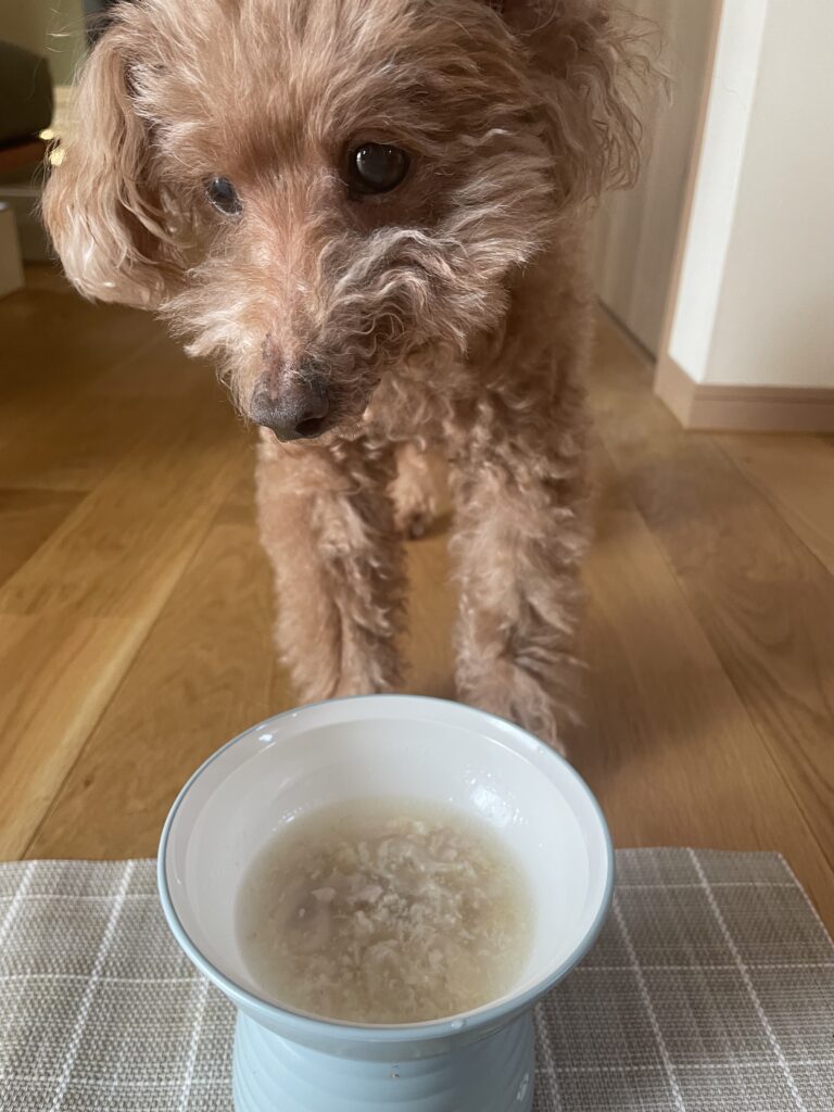 ある日、チキンスープに炊いたごはん、細かく刻んだ野菜と鶏肉を加えて煮込んで出してみたところ、驚くほど嬉しそうに口を動かし、あっという間に器を空っぽに。長い時間をかけて食べるのが当たり前になっていたので、その日の食べっぷりはとても印象的でした。