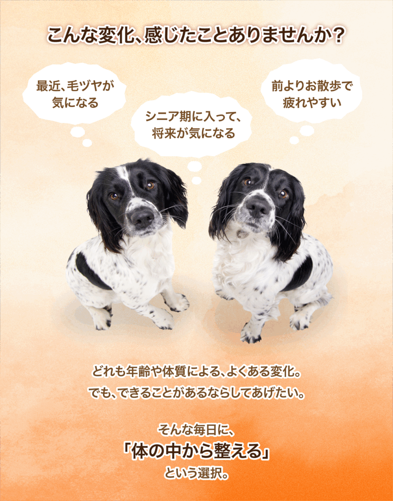 毎日の食事に取り入れることで、健康維持やシニア期のケア、皮膚や被毛のコンディション維持など、全身のサポートにつながります。